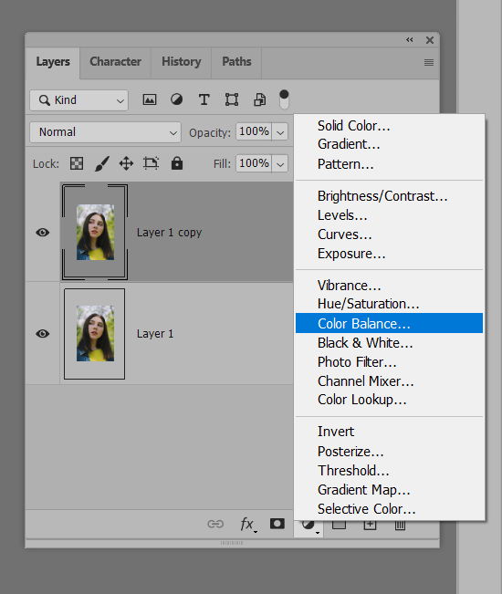 레이어패널 하단메뉴 - 어드저스트먼트 - 원하는 조정 옵션 셀렉